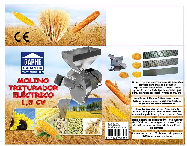 Equipped with double blade uo pra validates both portions as grinding for grinding grain, in addition, includes four sieves Elegua function of the texture desired grind and double alimentacilon system through upper hopper for introducing grain or through nozzle front for large portions.