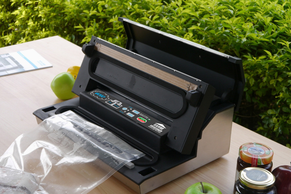 Envasadora semiprofesional automatica con cubierta inox, compartimento para rollos con cuchilla incorporada, bomba de doble cuerpo y barra de sellado de 3mm con posibilidad de realizar incluso sellado doble.