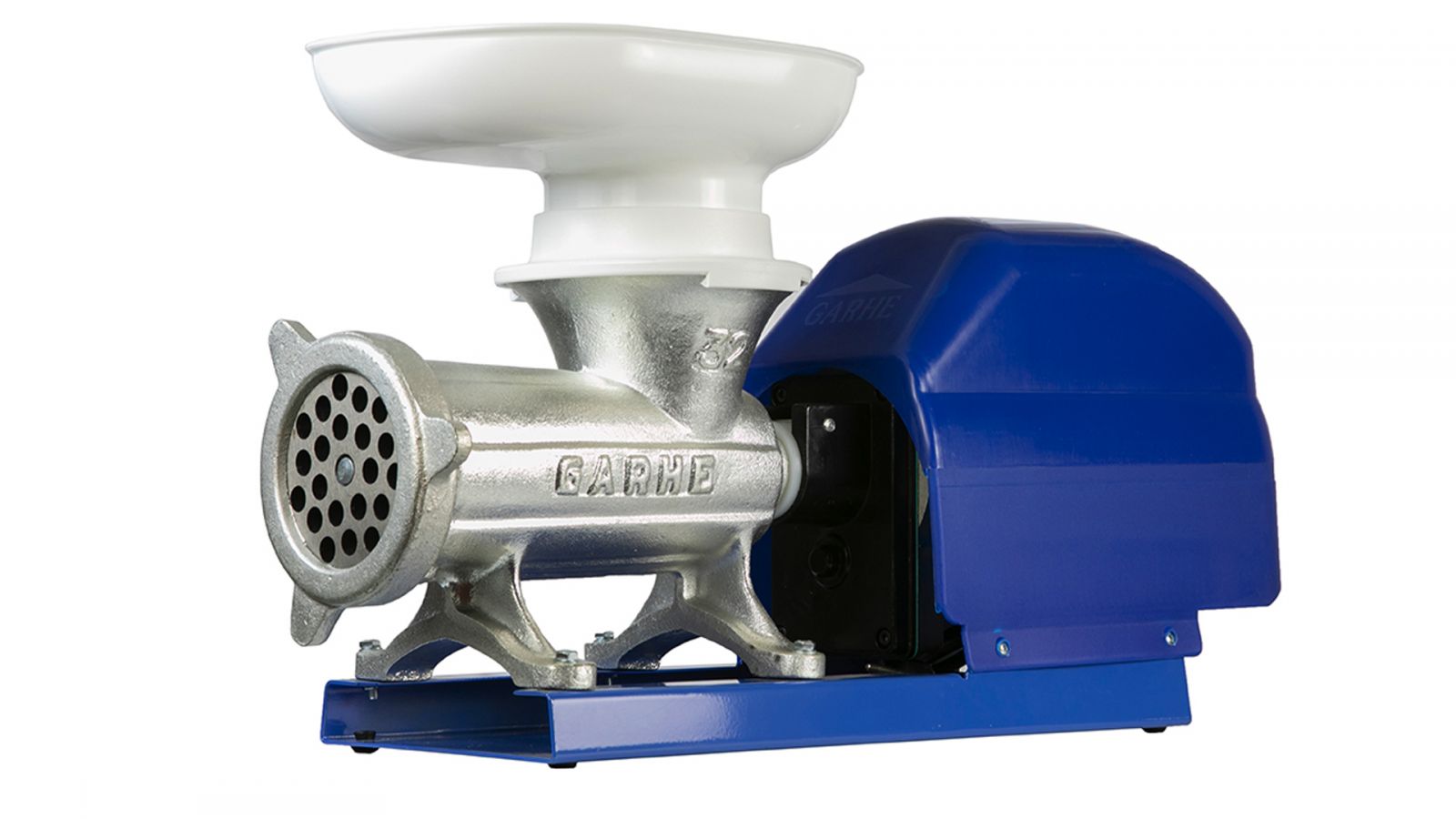 Picadora embutidora eléctrica Nº32 sobre base metálica, con cabezal tradicional de boca ovalada extra ancha, equipada con una tolva especial que matiene este ancho a la vez que garantiza una seguridad total.