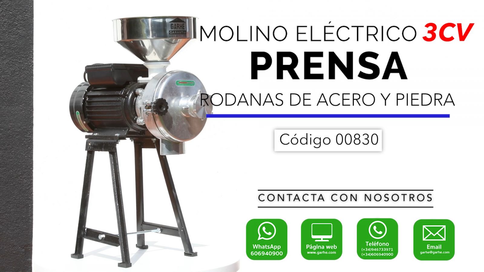 Molino Eléctrico de Prensa Garhe, 3hp de potencia con rodanas de acero y de piedra